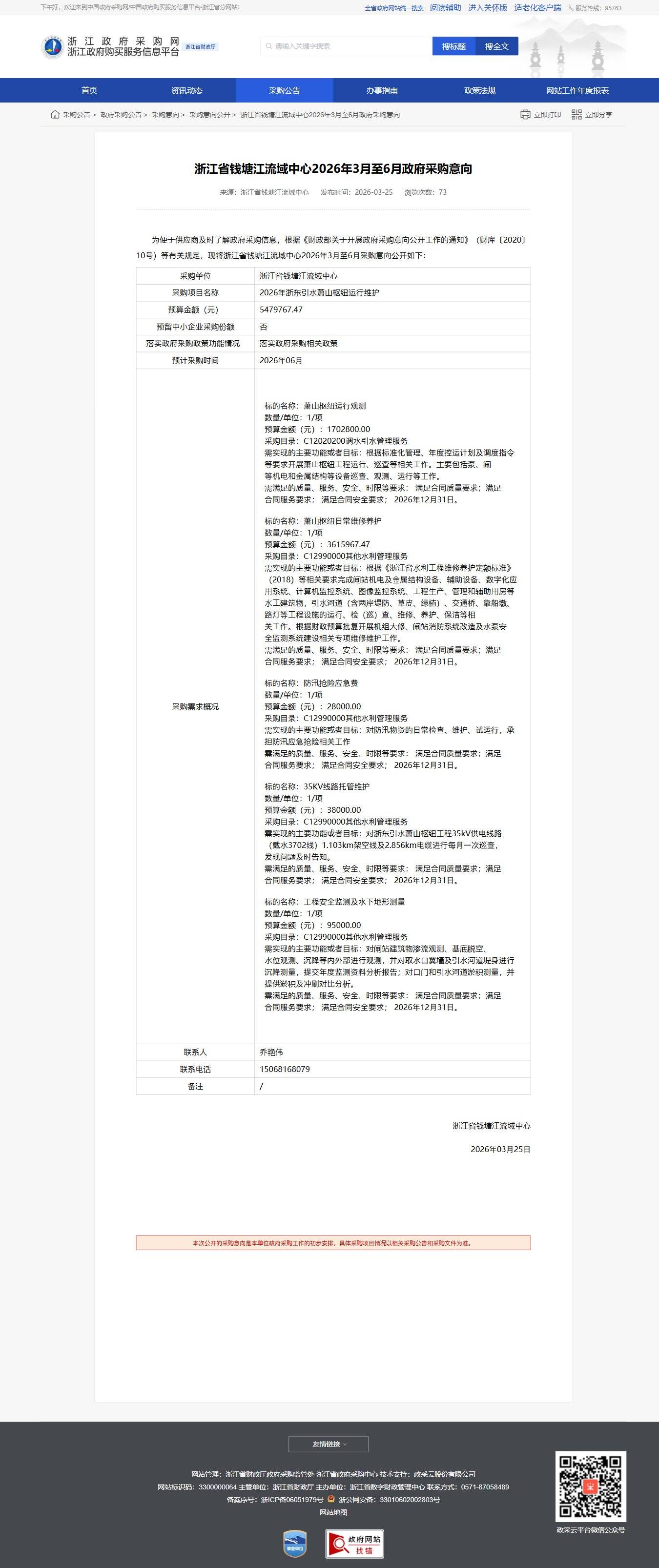 浙江省錢塘江流域中心2026年3月至6月政府采購意向公開: