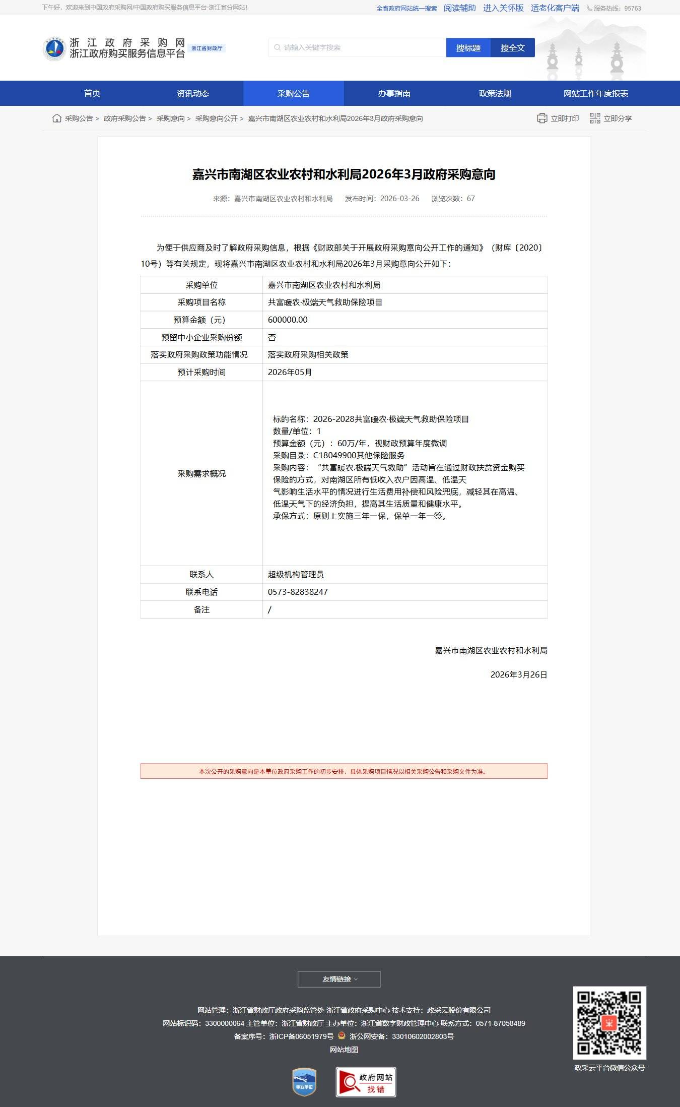 浙江嘉興市南湖區農業農村和水利局2026年3月政府采購意向公告
