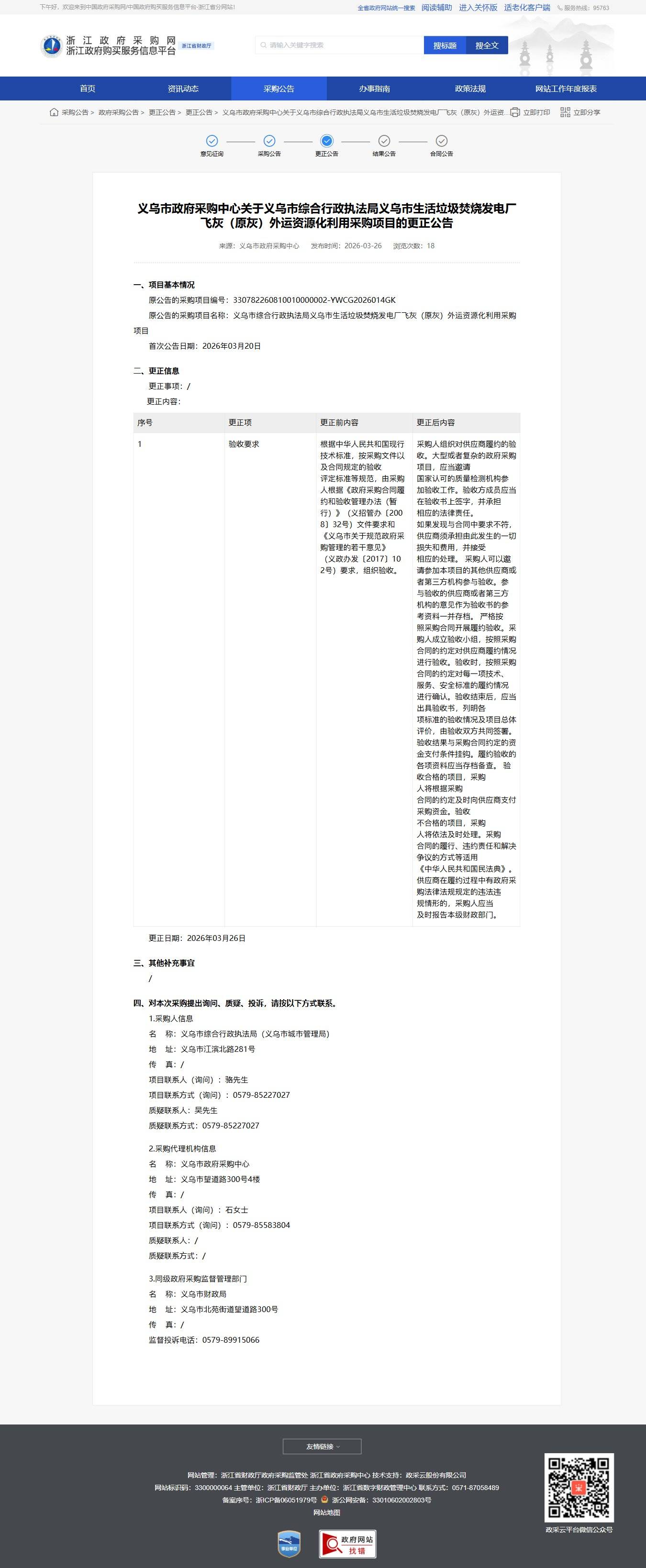 浙江關于義烏市綜合行政執(zhí)法局義烏市生活垃圾焚燒發(fā)電廠飛灰(原灰)外運資源化利用采購項目的更正公告義烏市政府采購中心