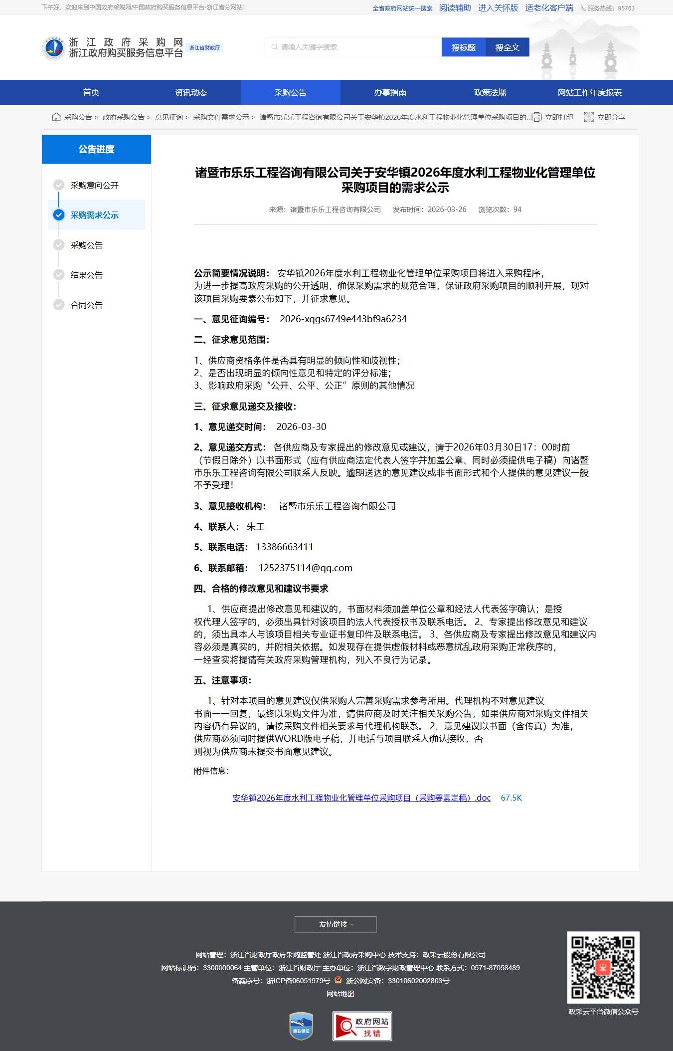 浙江關于安華鎮2026年度水利工程物業化管理單位采購項目的需求公示