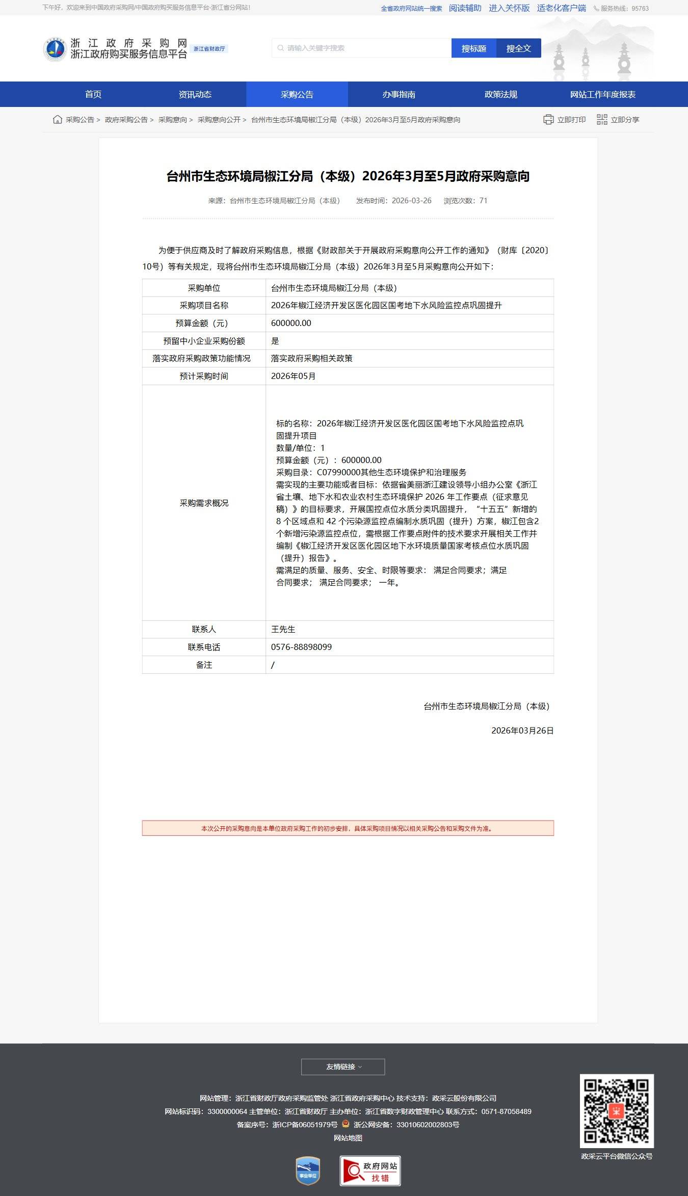 臺州市生態環境局椒江分局(本級)2026年3月至5月政府采購意向