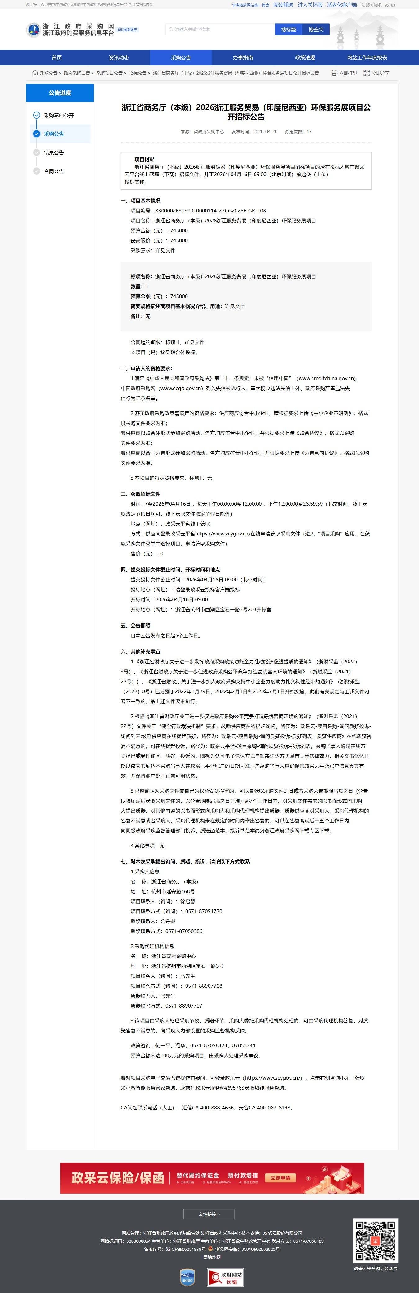 浙江省商務廳(本級)2026浙江服務貿易(印度尼西亞)環保服務展項目公開招標公告
